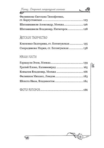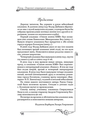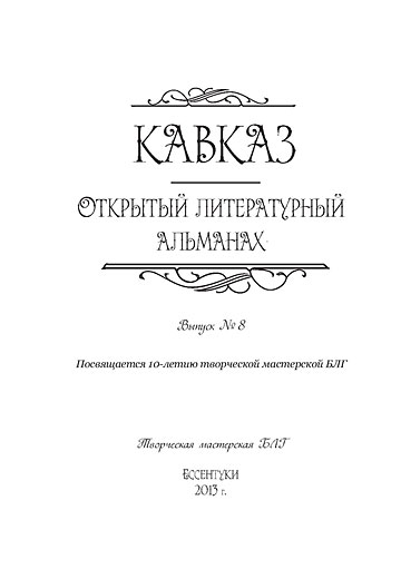 открытый литературный альманах «Кавказ» № 8, объединяет в своих рядах самых разных (по возрасту, по профессии) творческих людей. В нем представлены проза, стихи, романс.