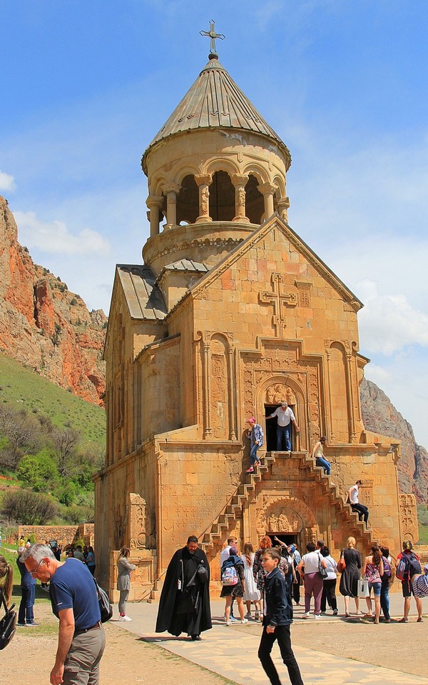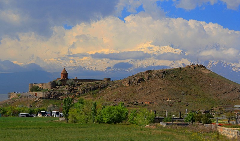 Утро погожее, завтрак в гостинице приемлемый, в автобус и далее. Едем в Араратскую долину, познакомится с храмом Хор Вирап. Немного времени и в окнах автобуса появляется Арарат, наполовину скрытый облаками. Смотрится грандиозно. Погода и впечатления самые хорошие, но надо двигаться дальше. Впереди цепочка Арени-Нораванк-церковь Св. Георгия. Ехать довольно долго, третий день на колёсах, хочется чего-то более спокойного.