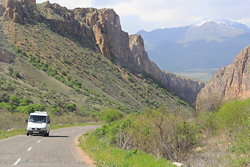 Дорога после Тбилиси не очень хороша, а после прохождения границы с Арменией, и вовсе, скорость нашего движения упала. Подъёмы , спуски, повороты, неважное состояние дороги не позволяют держать скорость более 60 км/час. Возле частных домов стоит много старых автомобилей, ещё из СССР. Часто встречаются ГАЗ-69 – мечта реставраторов и коллекционеров. Проезжаем Дилижан, кажется вот-вот появится из-за поворота Фрунзик Мкртчан на красном КРАЗе, но увы. Ну, вот и Севан, погода пасмурная, холодно. Остановка возле монастырского комплекса Севанаванк.