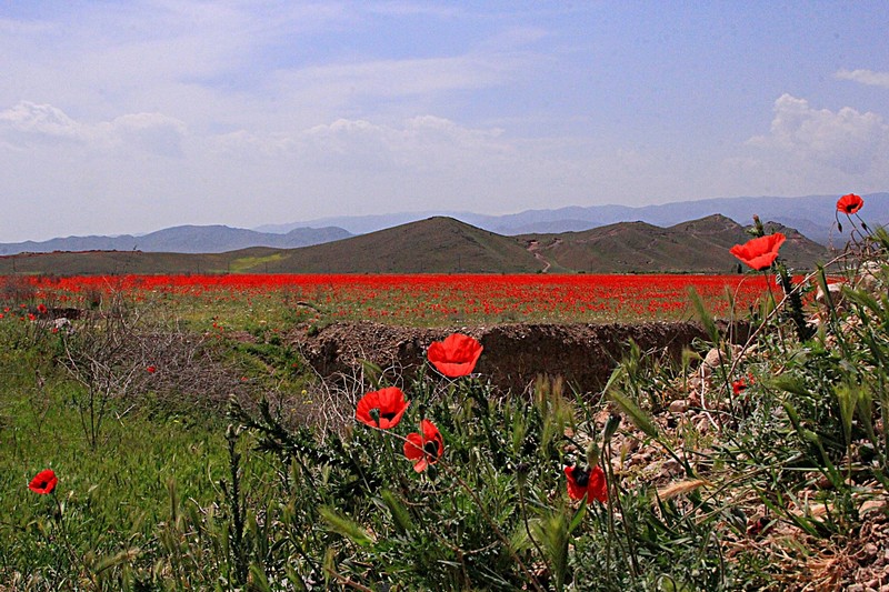 Маковые поля, живописная природа Армении. Горы не такие как у нас, но это горы.