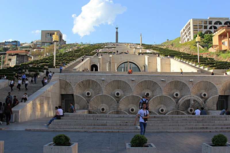 Спешим в Ереван и, наконец-то, отправляемся на прогулку по центральной части Еревана. Дело к вечеру, проходим к знаменитому Каскаду, любуемся панорамой города. Из-за облаков даёт на себя посмотреть Арарат и направляемся на площадь Республики, где начинается очень эффектное цветомузыкальное и фонтанное представление.