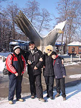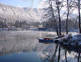 На улице по- прежнему морозно и над бассейном поднимается густой, непроницаемый туман, вода-сказка. Два часа, проведённые в бассейне пролетели незаметно и пора отправляться в дальнейшую путь-дорогу. Наша небольшая группа едет к знаменитому Голубому озеру, расположенному выше по долине реки Черек. Два десятка километров, позади остаются селения Кашхатау, Бабугент и вот мы на берегу Голубого озера. Озеро является карстовым провалом, глубиной в несколько сотен метров, купаются здесь редкие смельчаки, вода холодная и поскольку вода имеет значительную часть сероводорода, крокодилы, дельфины и прочая живность в озере не живёт. Озеро имеет огромную популярность среди отдыхающих курортов КМВ, Кабарды и Осетии из-за необыкновенного голубого оттенка воды, редкой красоты. На берегу оборудован современный Дайвинг-центр и частенько и в воде и на берегу можно видеть дайверов или аквалангистов, совершающих погружение в воды этого озера. Рядом с озером две стоянки для транспорта, есть ещё и платная, останавливаемся на верхней у "Орла" – это скульптура, выполненная владельцем небольшого кафе, ему же принадлежит и "медвежья пасть" и "ослик", на котором любят фотографировать детей. Делаем заказ на шашлык, хычины и отправляемся на осмотр озера, параллельно набираем сувениры, выставленные на продажу местными жителями это войлочные и вязанные изделия. Через полчаса начинается пир: замечательная шурпа, потрясающий шашлык и нежнейшие хычины , рядом в камине потрескивают поленья дров, создавая особый, yнеповторимый уют. Домой не торопимся и, тем не менее, к 18 часам въезжаем в Ессентуки: морозец, вечерние сумерки, приятная усталость.
